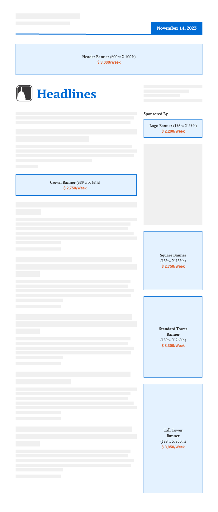 | Header Banner Advertisement | $3,000/week | 600w x 100h at 72 dpi |